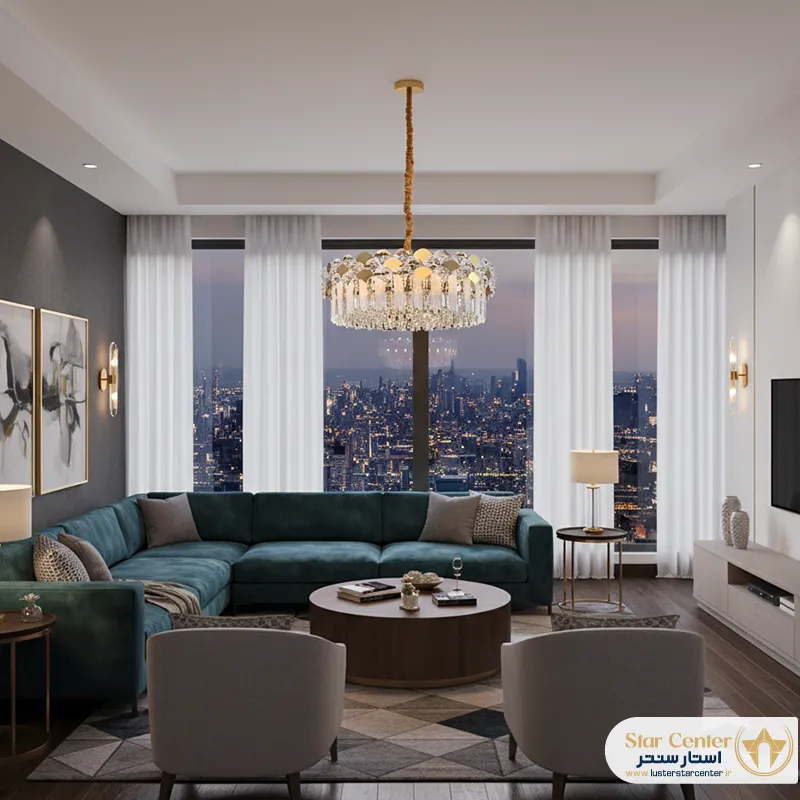 - کریستال مدرن: آویزهای کریستالی نور را به زیبایی شکسته و جلوهای شیک ایجاد میکنند.