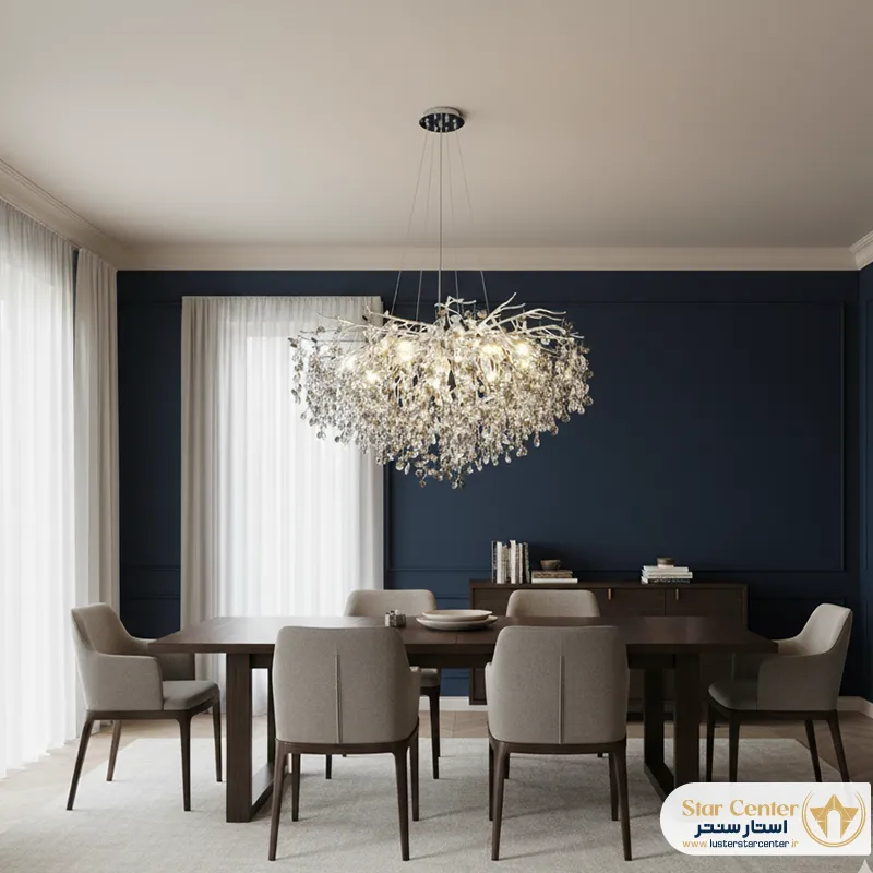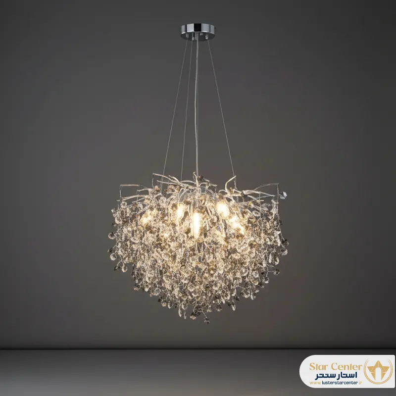 2. چگونه بین رنگ طلایی با کریستال روشن و کروم با کریستال دودی انتخاب کنم؟انتخاب رنگ به سبک دکوراسیون شما بستگی دارد. رنگ طلایی با کریستال‌های روشن (سفید و عسلی) جلوه‌ای گرم، لوکس و کلاسیک‌تر دارد و با رنگ‌های گرم هماهنگ است. در مقابل، رنگ کروم با کریستال دودی، ظاهری مدرن‌تر، سردتر و کمی رسمی‌تر ایجاد می‌کند و برای دکوراسیون‌های مدرن و مینیمال با پالت رنگی خنثی یا سرد، انتخابی عالی است.