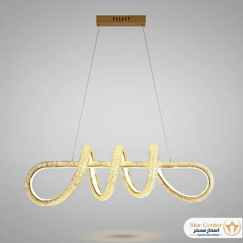 آویز SMD با رنگ طلایی، جنس بدنه کریستال و پلکسی، منبع نور SMD و عرض ۱ متر، انتخابی مدرن و با مصرف انرژی کم برای روشنایی است.