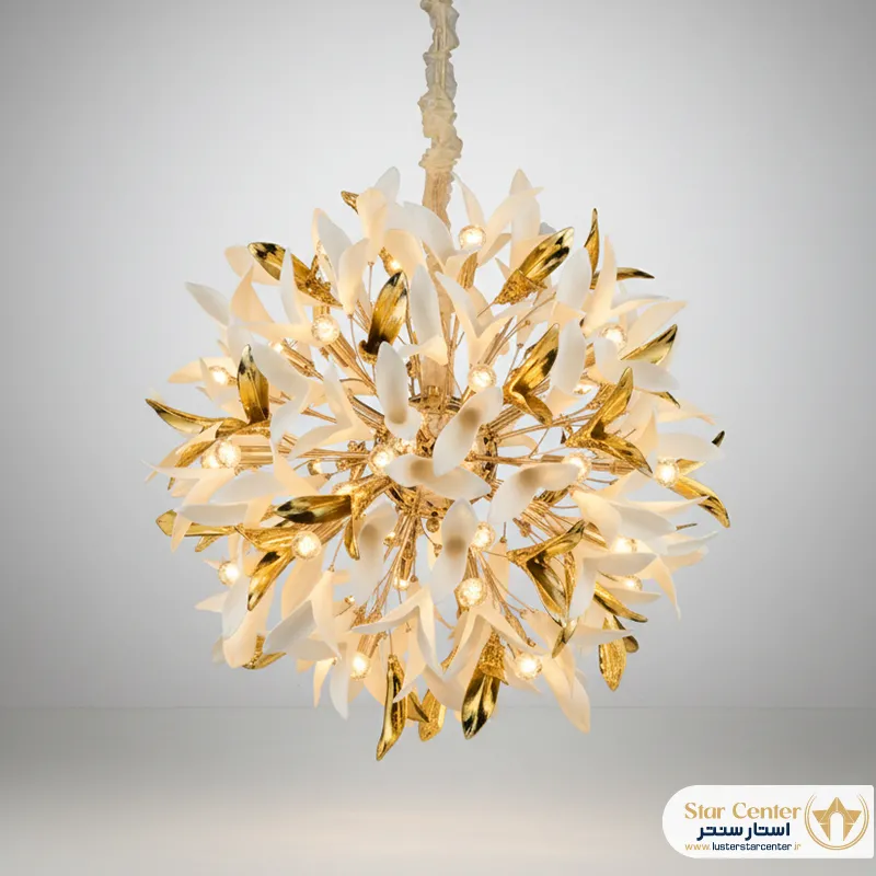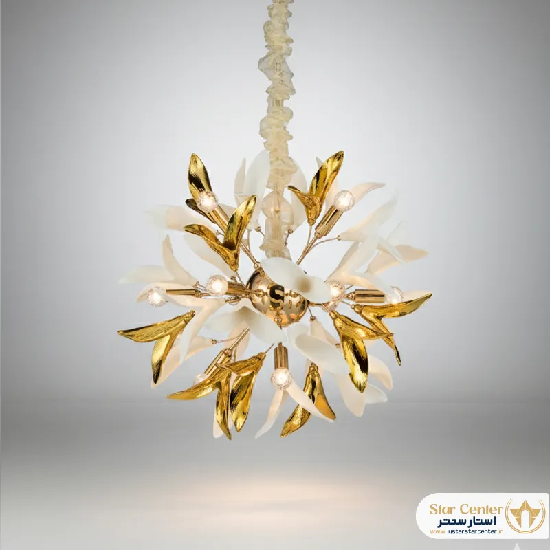 لوستر پتالیـا با طراحی مدرن و شیک، ترکیبی از مواد با کیفیت سرامیک، کریستال و فلز است که جلوهای لوکس و متفاوت به فضای شما میبخشد. این لوستر بهخوبی نور لامپهای شمعی را در خود جای داده و فضایی گرم و دلنشین ایجاد میکند.