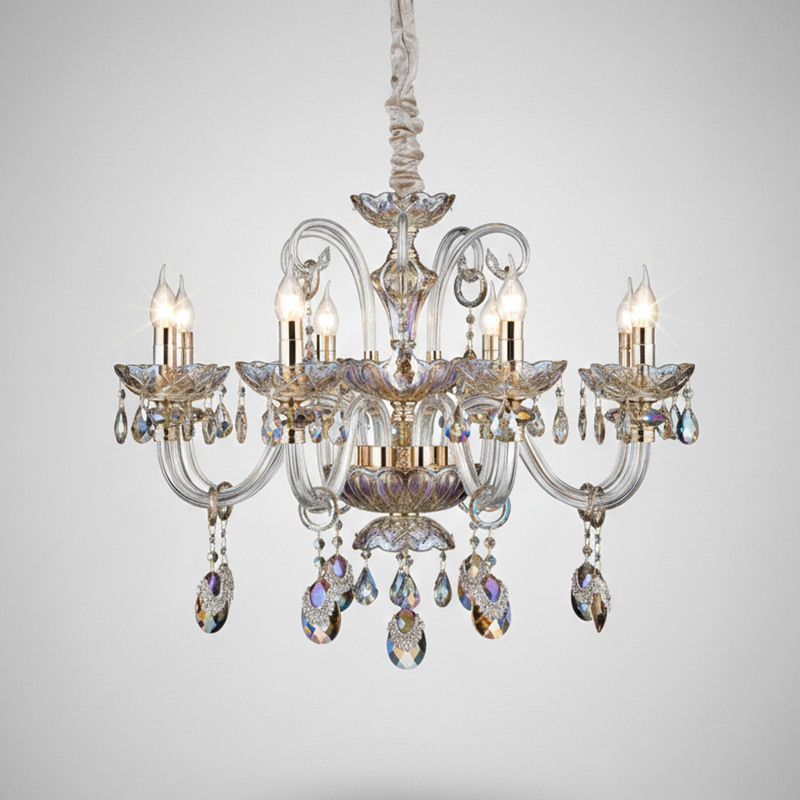 • نورپردازی خیره‌کننده: انعکاس نور از کریستال‌های تراش‌خورده، فضایی مجلل، پرنور و پویا ایجاد می‌کند.
