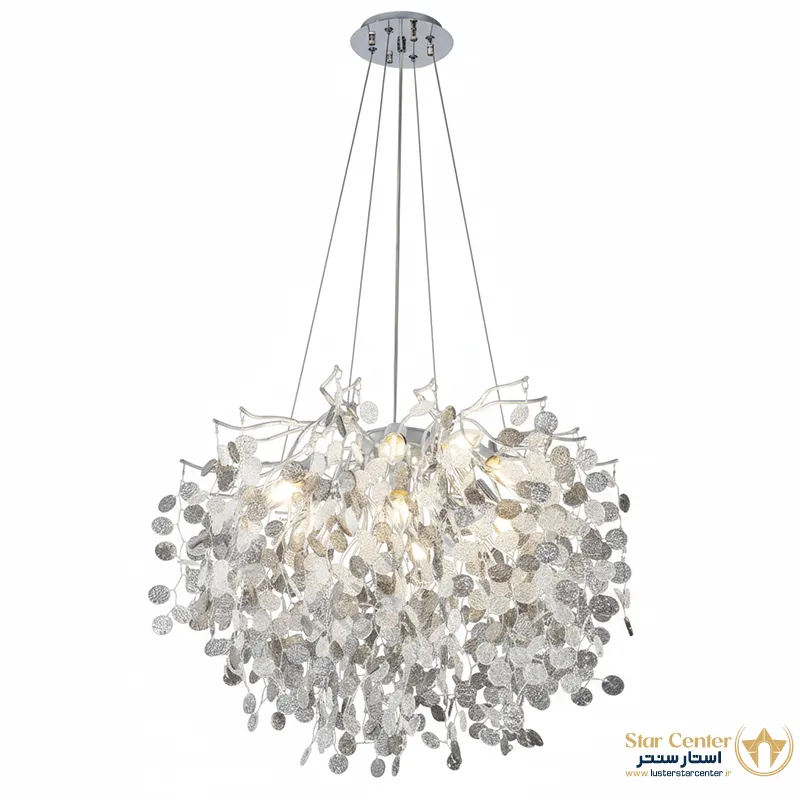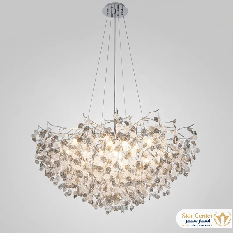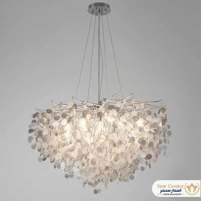ارائه شده است. این لوستر با الهام از فرم درختی و آویزهای کریستالی شفاف، محیط شما را با نوری گرم و طبیعی روشن میکند. تلفیق شاخههای آلومینیومی و کریستالهای براق، ترکیبی از زیبایی ارگانیک و نظم معماری را خلق کرده است.