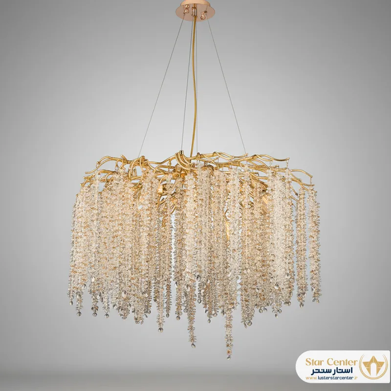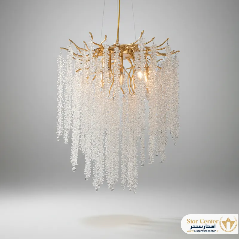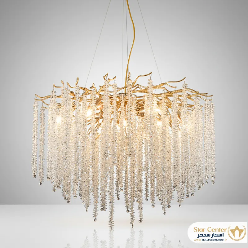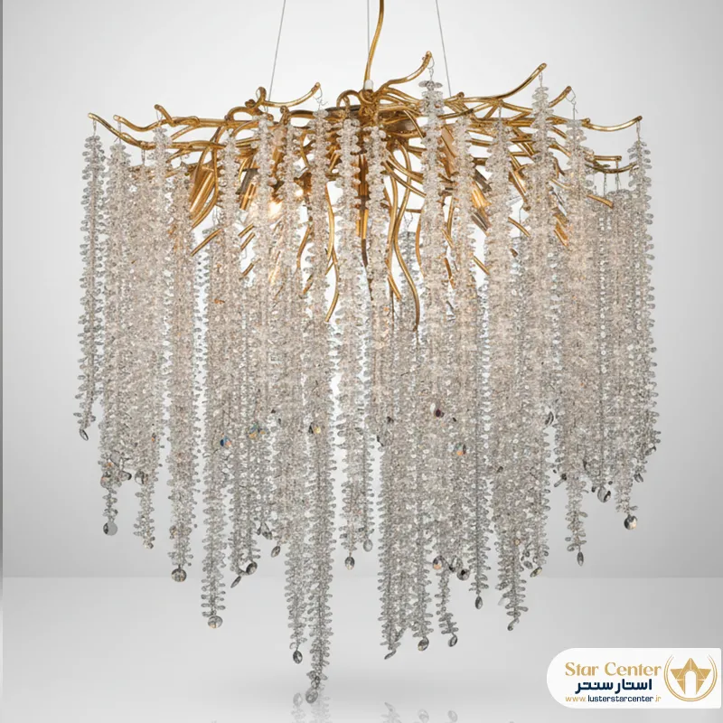 است که با طراحی شاخهای و کریستالهای چندوجهی، نگاه هر بینندهای را مجذوب میکند. این مدل با الهام از فرم طبیعی درخت، در کنار متریال آلومینیوم سبک و براق، جلوهای شاعرانه و باشکوه به فضا میبخشد.