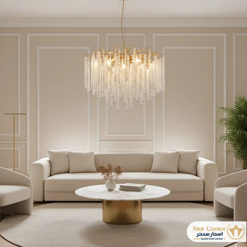 طلایی با کریستالهای سفید و عسلی برای جلوهای گرمتر، و کروم با کریستال دودی برای فضاهای مدرن و سرد. هر دو رنگ در سبکهای مدرن و کلاسیک هماهنگی چشمگیری دارند.